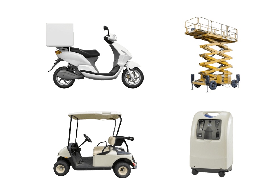 Motocicletas, elevadores de tijera, carros de golf, equipos médicos, etc.